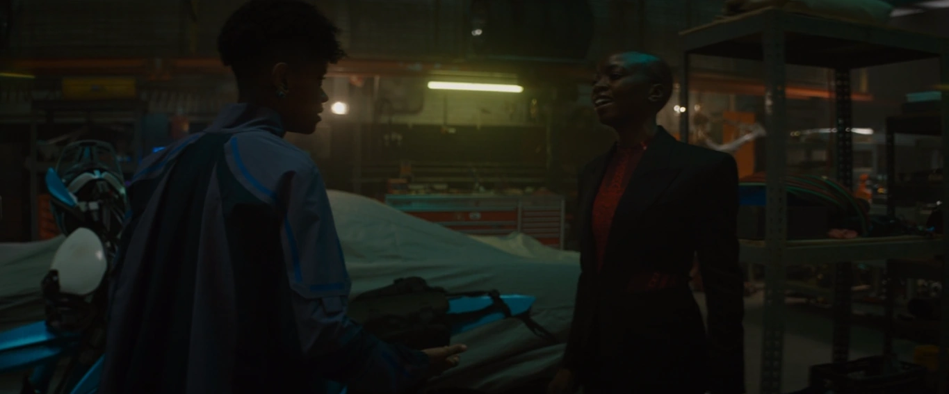 Dans le laboratoire de Shuri, Okoye a regardé l'armure de Midnight Angel que Shuri préparait, en disant que c'était toujours laid. Shuri a alors montré comment elle avait démonté le détecteur pour voir les pièces. Okoye a tiré Ramonda de côté, lui demandant de laisser Shuri partir avec elle à Cambridge pour rencontrer la scientifique. Ramonda a d'abord refusé, mais Okoye a argumenté que ce serait un bon moyen pour Shuri de sortir de son laboratoire.[12]