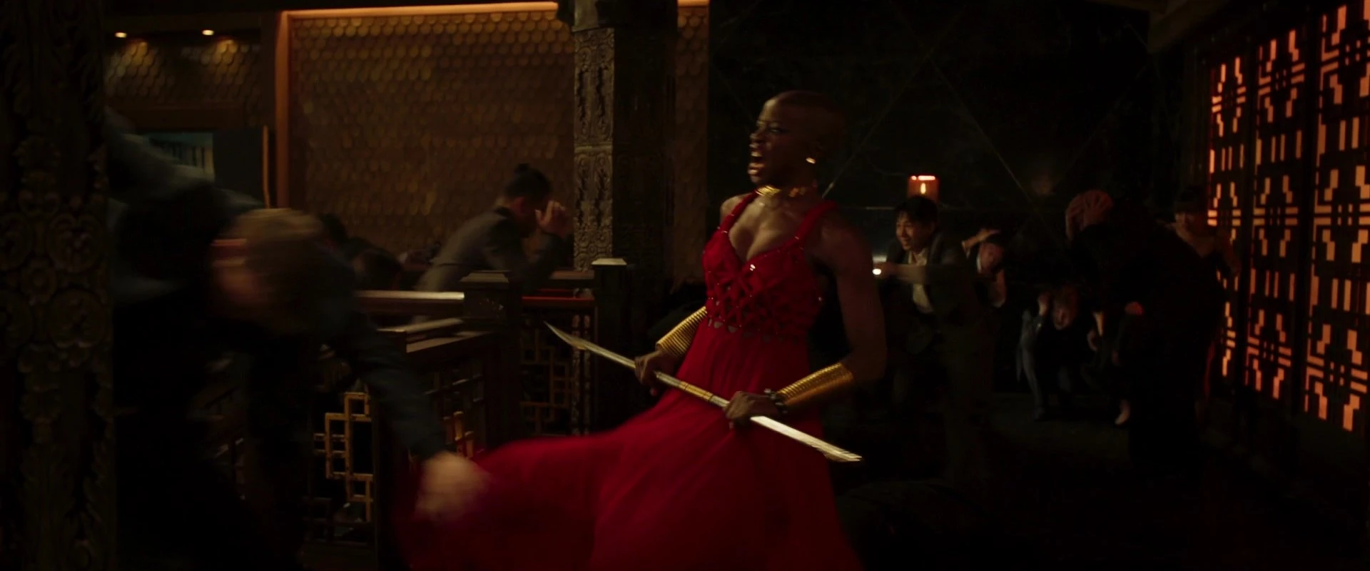 Klaue est finalement arrivé au casino avec plus de gardes du corps, et Okoye a remarqué qu'ils étaient tous armés. Alors que Nakia avait l'intention d'avancer contre Klaue, Okoye lui a ordonné d'attendre, mais cela l'a amenée à être identifiée comme une hostile wakandaise par un garde du corps. Sachant que sa couverture n'était plus d'actualité, Okoye a dégainé sa lance en vibranium et a abattu les deux gardes du corps qui l'ont attaquée. Klaue a commencé une fusillade dans le casino et s'est échappé.