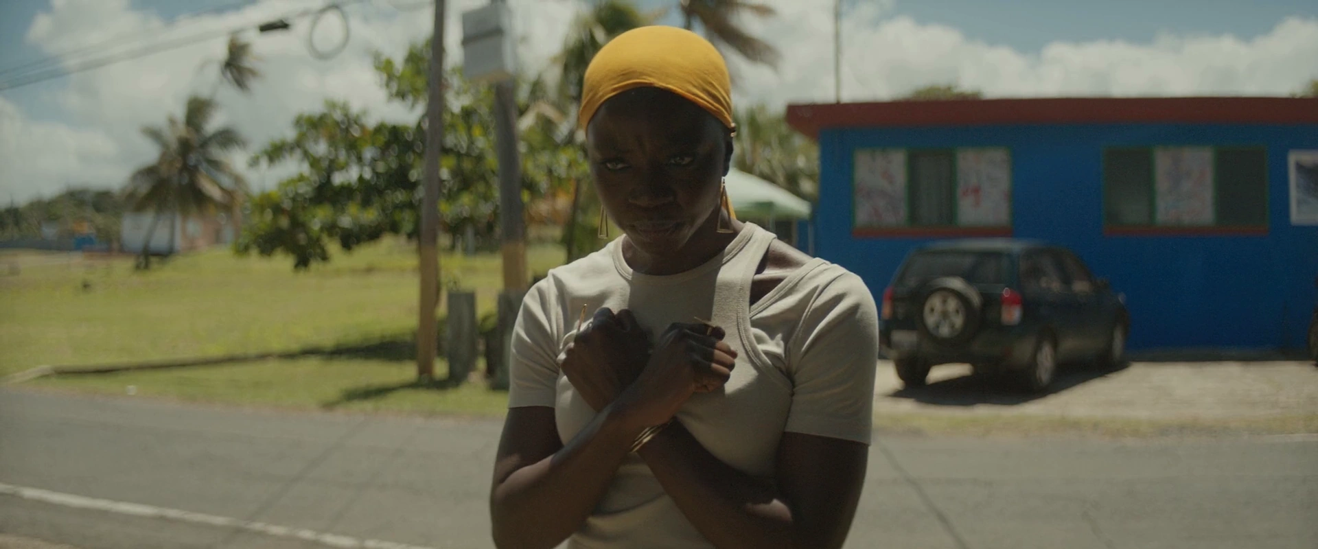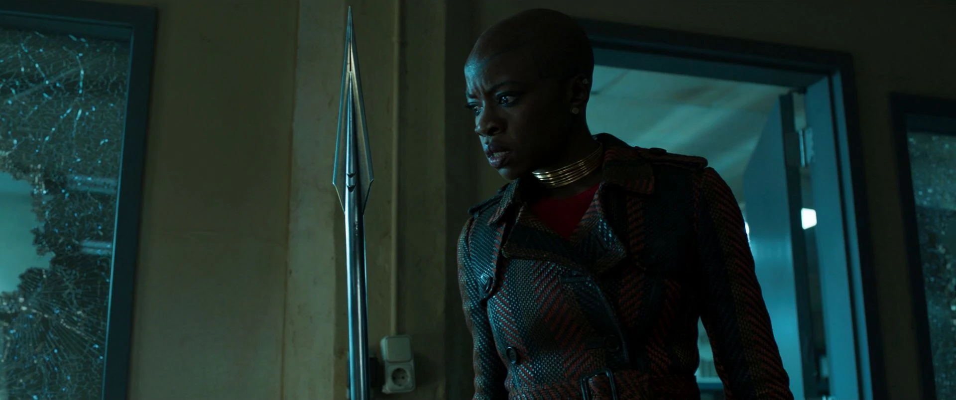 En suivant le SUV de Klaue, Okoye a commenté l'utilisation d'armes à feu comme primitive pendant que les hommes de main tiraient sur leur voiture en vibranium. Devenant calmement frustrée, Okoye se glisse par la fenêtre du passager et grimpe sur le toit de sa propre voiture pendant que Nakia conduisait, poignardant sa lance en vibranium sur le toit du véhicule comme poignée. Nakia recule et se faufile dans la circulation alors qu'Okoye, engage son mécanisme de lance, puis se stabilise et lance sa lance sur le SUV arrière ; l'arme est passée à travers le pare-brise arrière et avant pour se coincer sur la route, provoquant l'écrasement du SUV et l'enlevant pour le décompte.