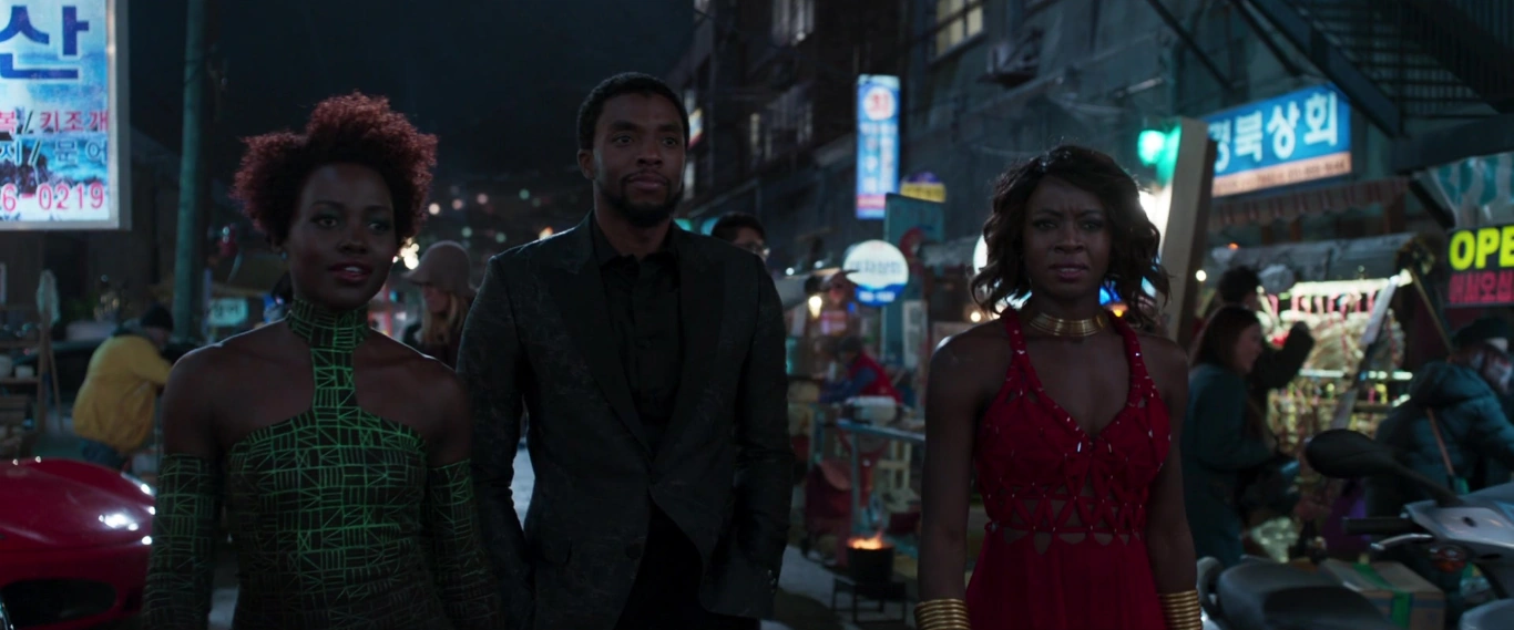 Après Nakia, Okoye l'a écoutée parler à une femme qui possédait une entreprise de marché aux poissons, lui disant de gagner le passage avec ses amis. Okoye est entrée au casino du marché de Jagalchi malgré ses soupçons à l'égard de la femme. En entrant, le groupe a décidé de se séparer pour couvrir une plus grande surface, Okoye demandant à ses partenaires de se concentrer sur la mission au lieu d'avoir des conversations personnelles. Alors que Nakia s'est assise au bar et a repéré des Américains, donc des acheteurs potentiels pour Klaue, Okoye en a vu d'autres entrer dans le casino avec des diamants, informant que la situation est une configuration. Pendant ce temps, Okoye a été informé par T'Challa qu'Everett Ross et la CIA étaient également présents.