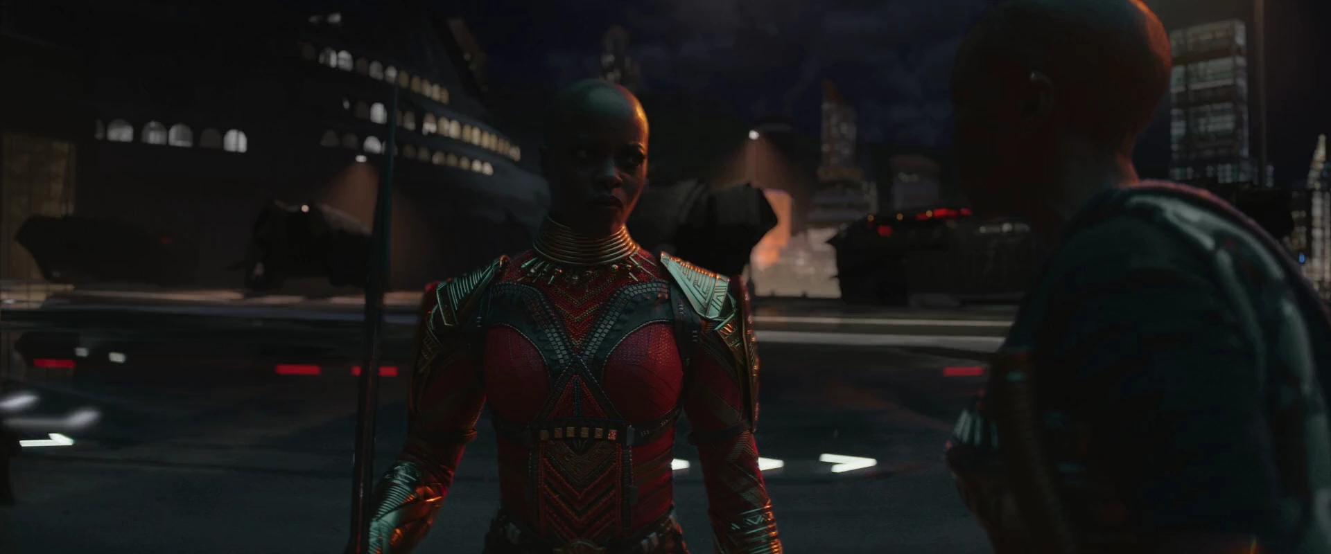 Alors que T'Challa et Nakia ont eu une brève conversation entre eux, un tireur survivant a tenté de les forcer à se rendre en menaçant un otage, seulement pour qu'Okoye désarme rapidement puis le traverse avec sa lance en vibranium, sauvant T'Challa d'un situation difficile et mettre fin à l'escarmouche. Okoye a taquiné T'Challa pour son manque de concentration et a regardé la femme retenue en otage. Alors qu'Okoye sauve les femmes, T'Challa raconte la mort de son père et l'invite au couronnement.