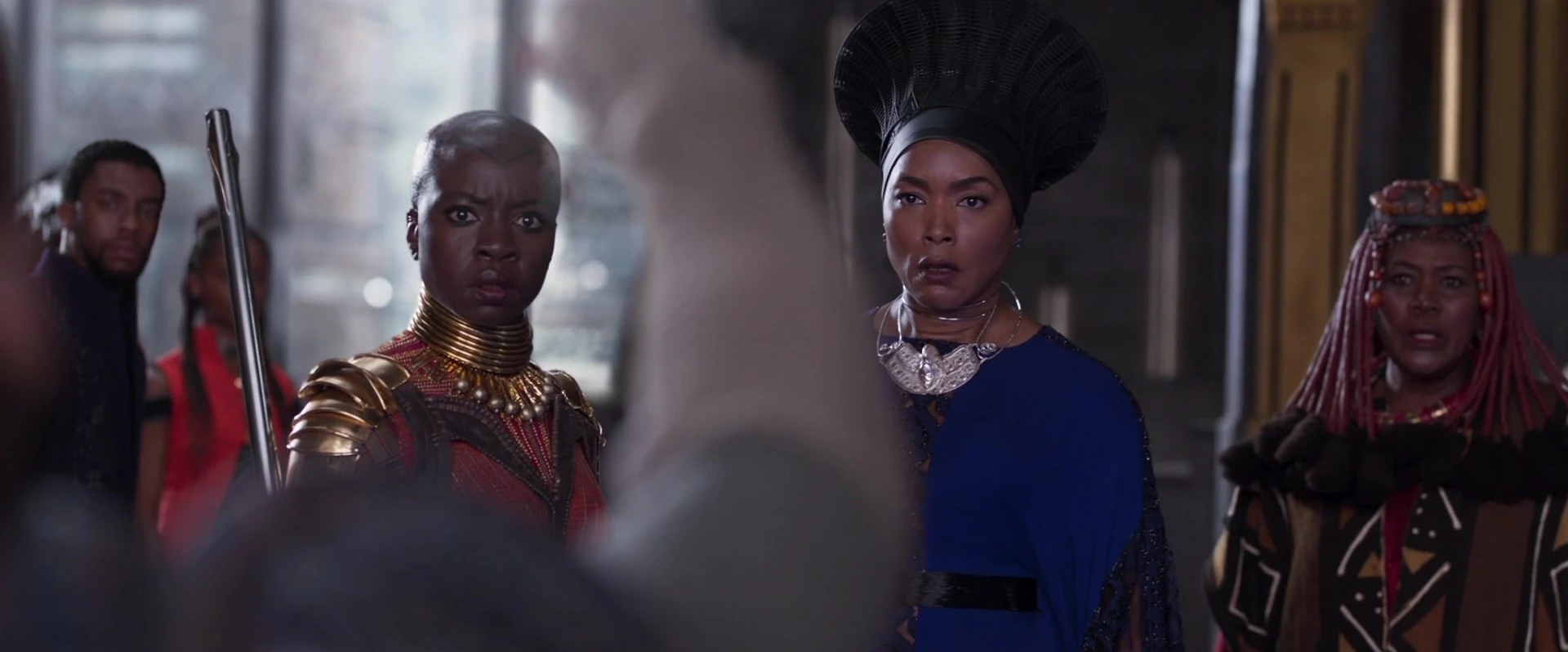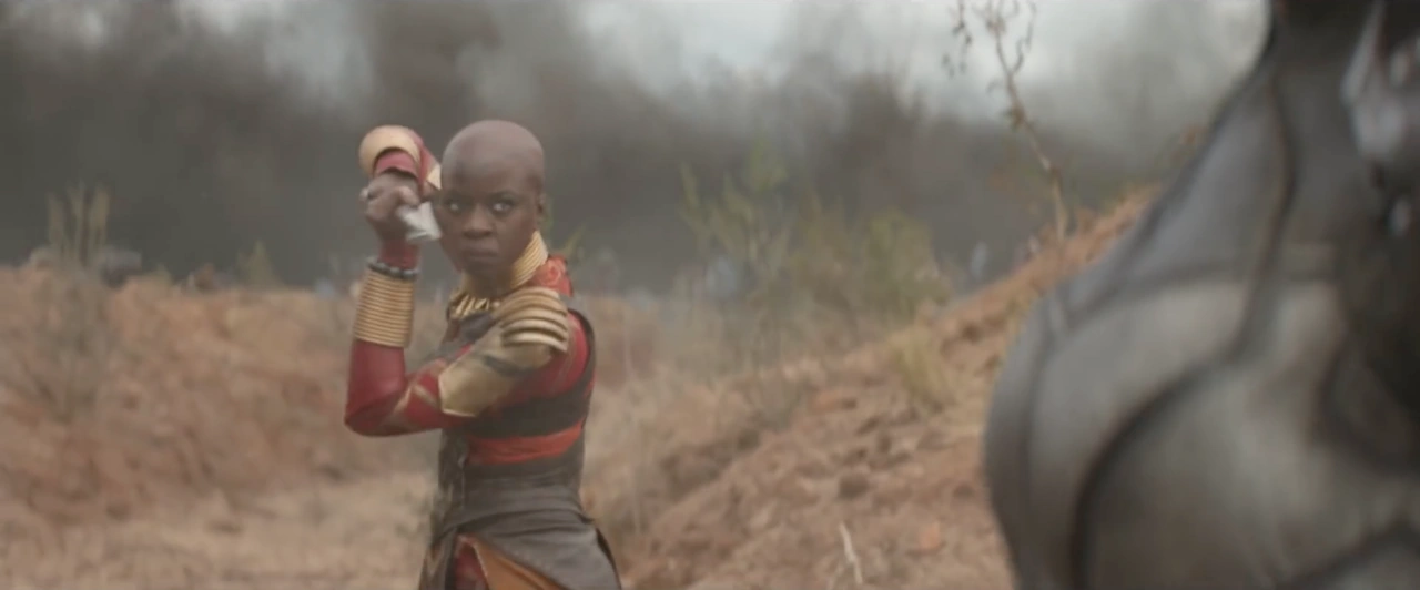 Elle s'oppose rapidement au défi d'Erik Killmonger, non seulement en raison du manque de respect flagrant de Killmonger envers les traditions wakandaises, mais aussi parce qu'elle connaît le potentiel désastreux que Killmonger détient pour la nation et pour le monde. En raison de son plus grand respect pour les traditions, cependant, elle est incapable d'empêcher Killmonger, qui a le droit légitime de revendiquer le trône, de défier T'Challa. En tant que générale de la Dora Milaje, Okoye se montre fière de sa calvitie. Elle était visiblement mécontente de devoir porter une perruque et s'est empressée de la jeter.