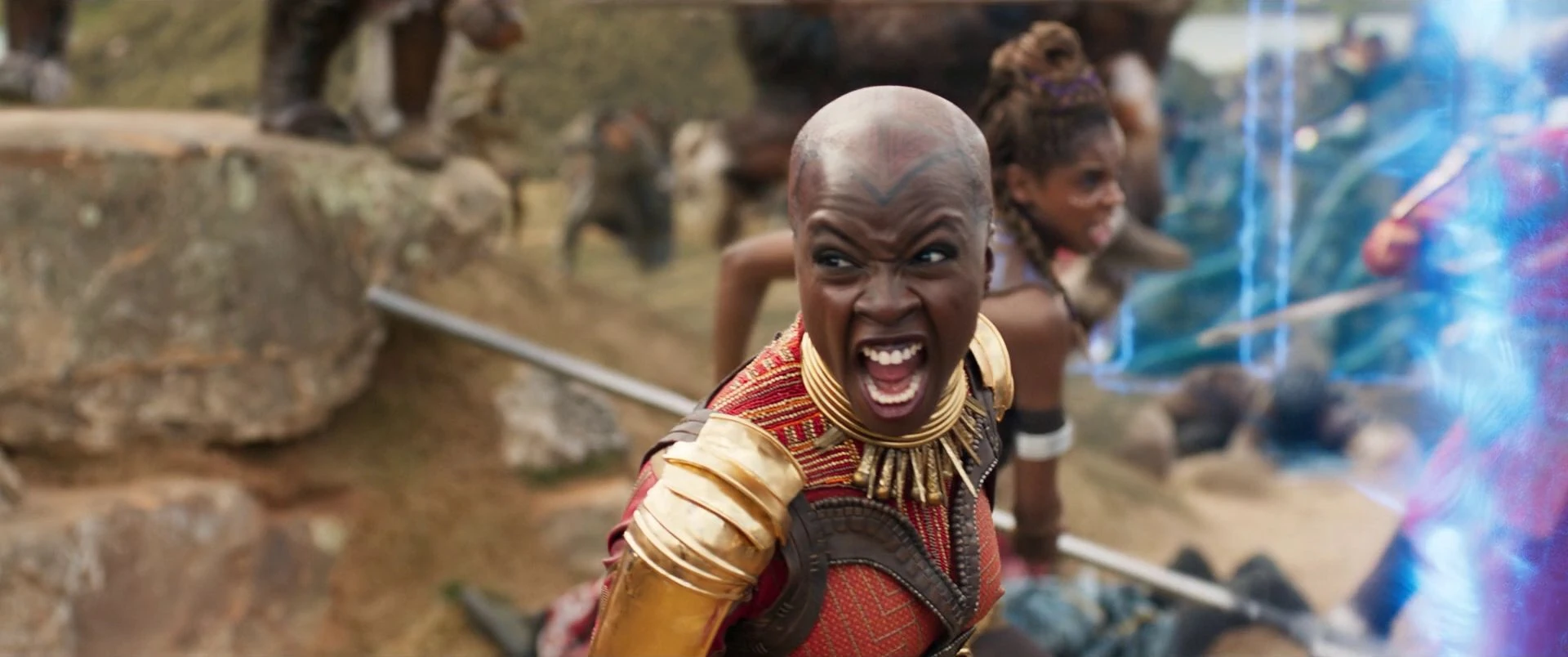 Okoye et ses soldats se sont furieusement battus contre Killmonger, qui a réussi à résister à leur assaut et a fait prisonnier Xoliswa. Alors qu'il l'exécutait, Okoye a crié de rage et les Dora Milaje ont repris leur attaque. Okoye et le groupe ont réussi à bloquer Killmonger entre leurs lances et l'ont presque dépouillé du collier qui lui permettait d'utiliser son costume, mais Killmonger a libéré une explosion d'énergie cinétique, renvoyant Okoye sur le champ de bataille.