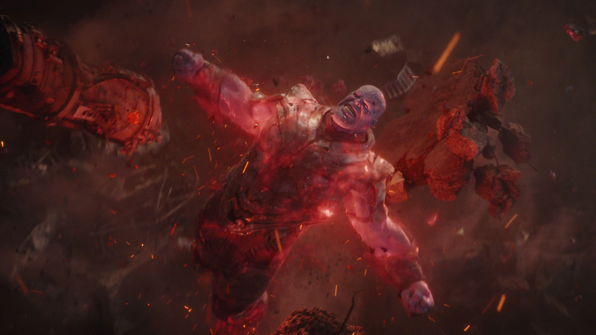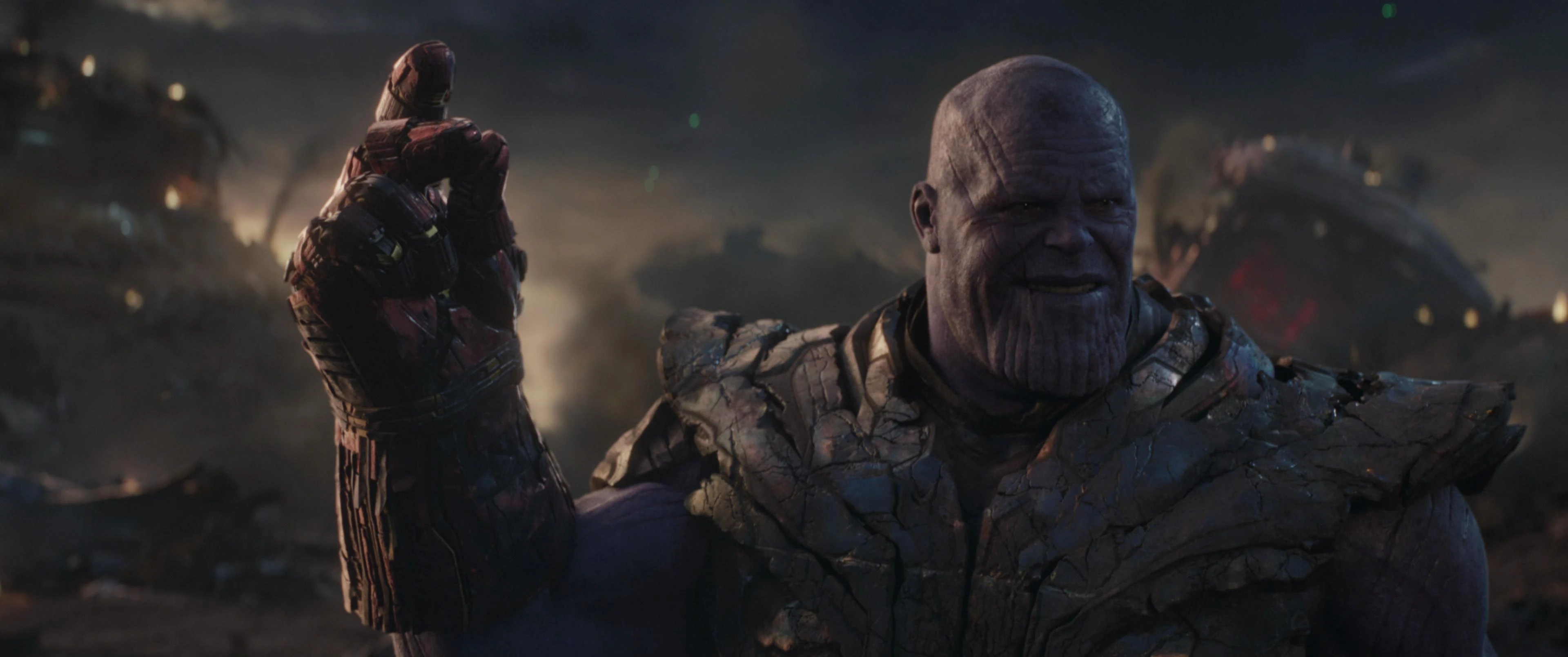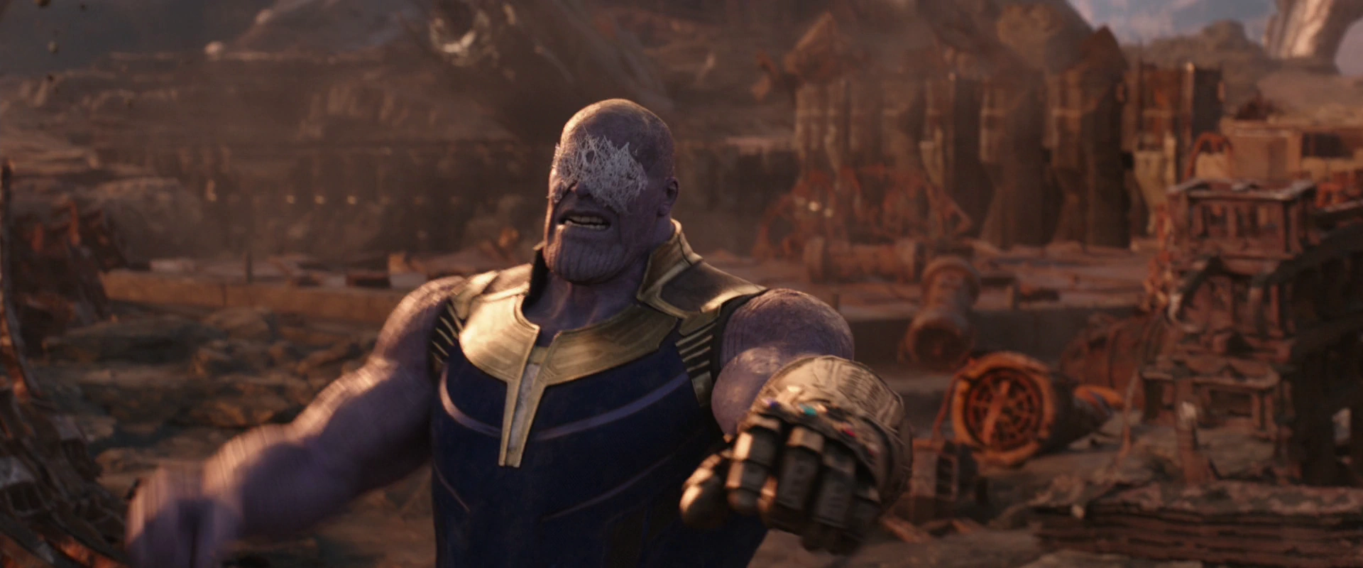 - Destruction des pierres : Thanos a pu détruire les pierres d'infinité en retournant leurs énergies contre elles, mais cela a encore endommagé le gant déjà paralysé et brûlé le côté gauche de son corps, fusionnant le gant à son bras et aggravant ses blessures.