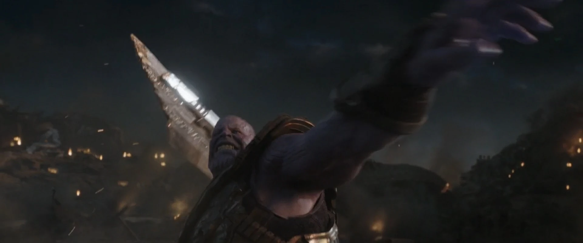 - Maîtrise de l'épée : Thanos possédait une compétence extraordinaire dans l'utilisation de son épée à double tranchant au combat, capable de combattre facilement les assauts coordonnés de Thor, Captain America et Iron Man, avec lui ayant pu bloquer les répulseurs d'Iron Man lorsqu'il était alimenté par la foudre de Thor tout en le surmontant simultanément et en bloquant une attaque de Thor en utilisant Stormbreaker après l'avoir juste lancé et ne pas l'avoir frappé, bien qu'il ait été désarmé, et a rapidement submergé Captain America armé à la fois de Mjølnir et de son bouclier et poignardé sa jambe avant entièrement le dominant et détruisant son bouclier. Thanos a également pu faire face à Wanda Maximoff avec, après avoir réussi à couper facilement les projectiles qu'elle lui a lancés et à bloquer ses coups d'énergie et a presque réussi à la vaincre, la poussant avec son épée, la forçant ainsi à utiliser ses pouvoirs pour le désarmer. Thanos a également été capable de le lancer avec habileté pour obtenir un effet de boomerang. Sa précision était suffisante pour pouvoir frapper et abattre Black Panther lorsque ce dernier se déplaçait à grande vitesse et faire exploser la camionnette de Luis pour empêcher Captain Marvel de s'échapper avec le gant. Thanos a également facilement utilisé le glaive de Corvus Glaive pour empaler et tuer Heimdall.